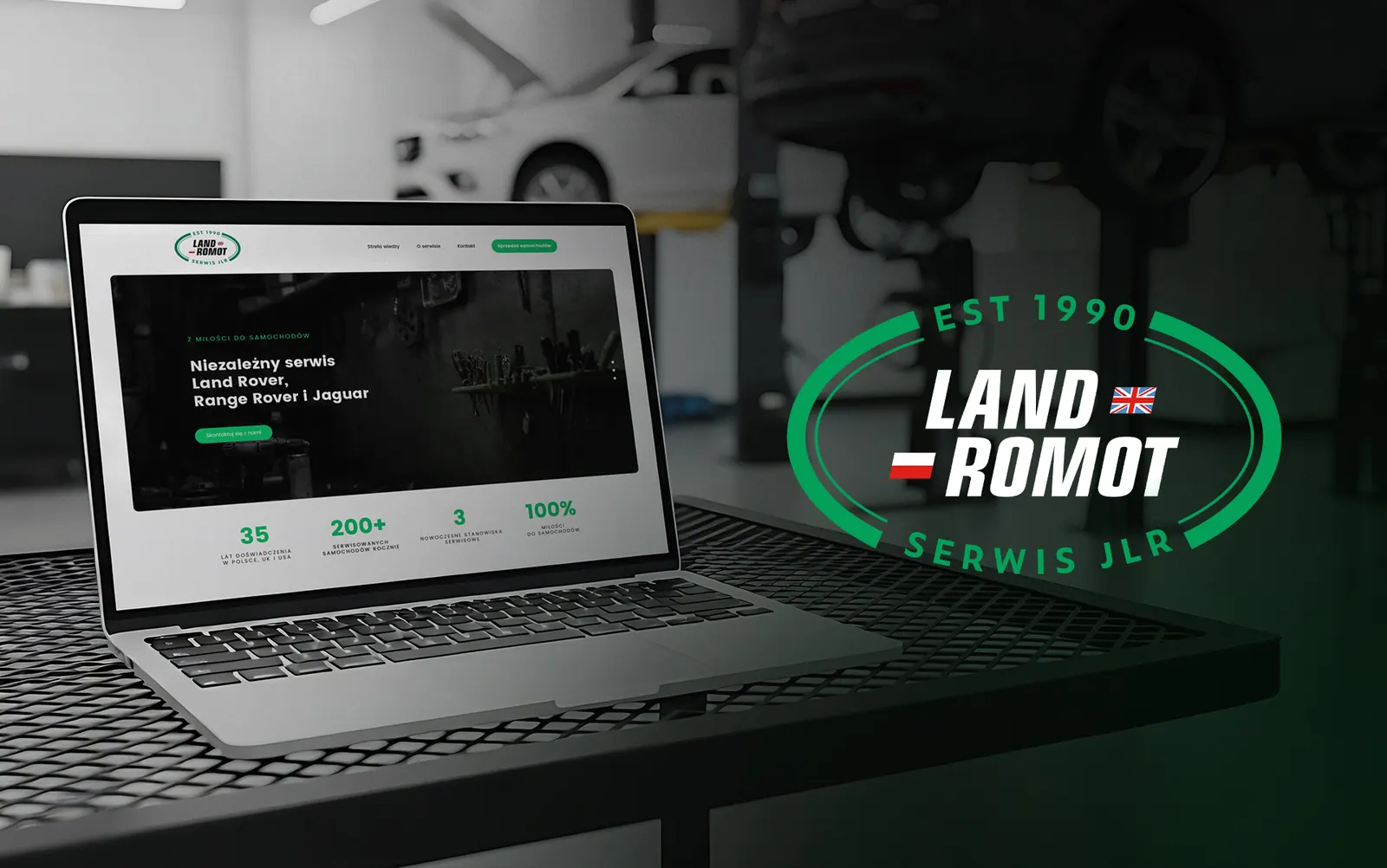 Pełna identyfikacja wizualna Land Romot — niezależnego serwisu Land Rover, Range Rover i Jaguar. Logotyp, wizytówki, materiały firmowe, druk wielkoformatowy oraz drobne nośniki marki — od reklamowych krówek po koszulki firmowe.