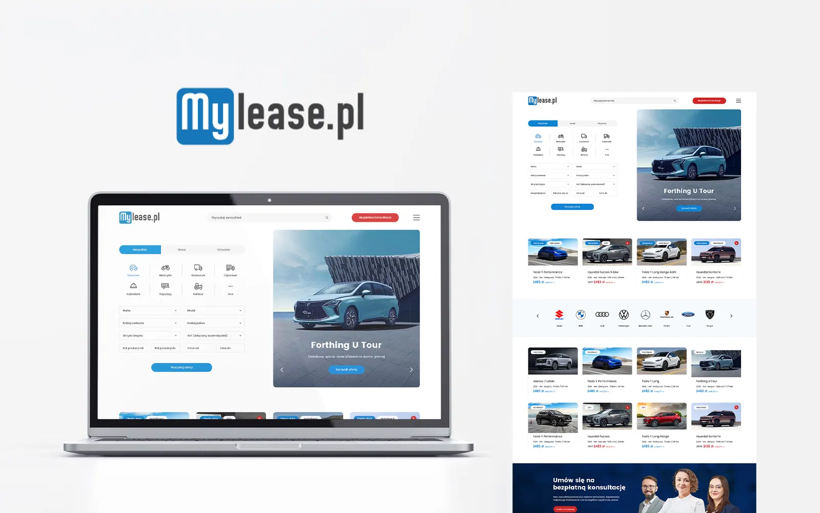 Strona internetowa platformy leasingowej MyLease — kalkulator rat, filtrowanie ofert i przejrzysty interfejs zaprojektowany z myślą o szybkim porównywaniu propozycji.